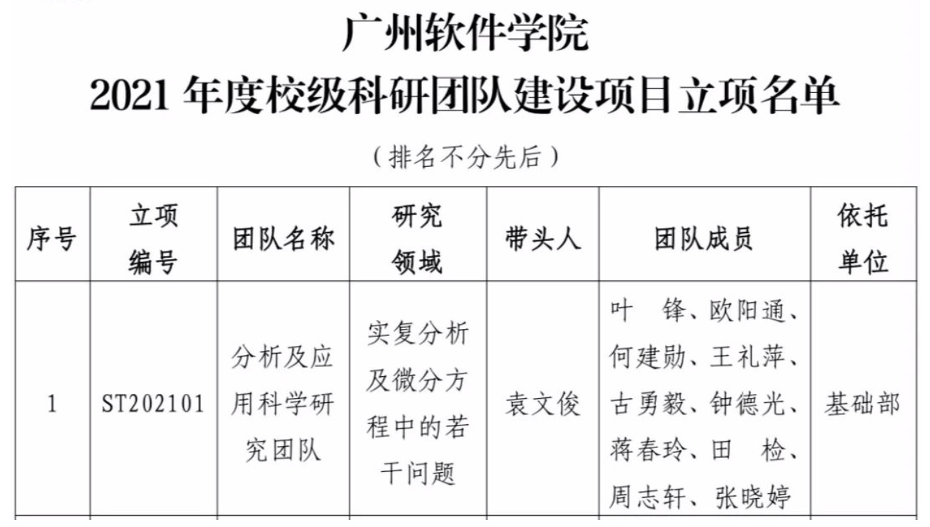 近日,学校下发“关于公布2021年度校级科研团队建设项目立项结果的通知”文件,经过专家评审、现场答辩、公示等各程序,确定3支科研团队立项为2021年度校级科研团队建设项目。我部以袁文俊教授为带头人,以叶锋等年轻教师为主要成员的“分析及应用科学研究团队”喜获立项。