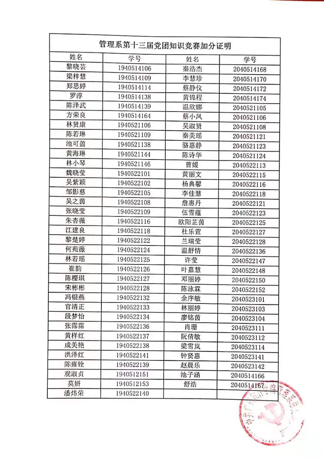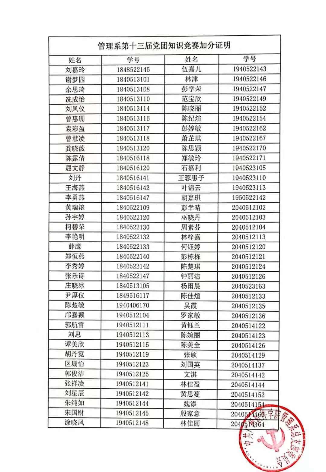 关于管理系第十三届党团知识竞赛加分证明的公示