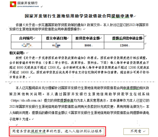 若学生存在可进行贷款提额申请的合同:点击“贷款提额申请”后会弹出“国家开发银行生源地信用助学贷款额度提升有关说明”,展示如下。