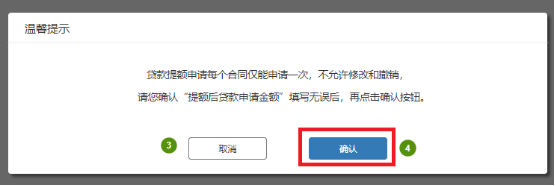 点击【同意本贷款提额申请单的内容,进入人脸识别认证程序】按钮,弹框提示:贷款提额申请每个合同仅能申请一次,不允许修改和撤销,请您确认“提额后贷款申请金额”填写无误后,再点击确认按钮!展示如下: