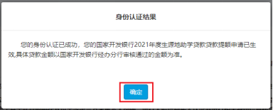在手机支付宝客户端完成身份认证后,返回生源地学生在线系统,点击“我已完成身份认证,点击查询”按钮。弹出身份认证结果。