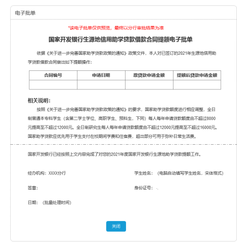 2.县资助中心已汇总提交合同;(请联系当地国家开发银行分行退回合同)3.已按照最新政策规定上限办理合同(本专科生上限12000元,研究生上限16000元)。