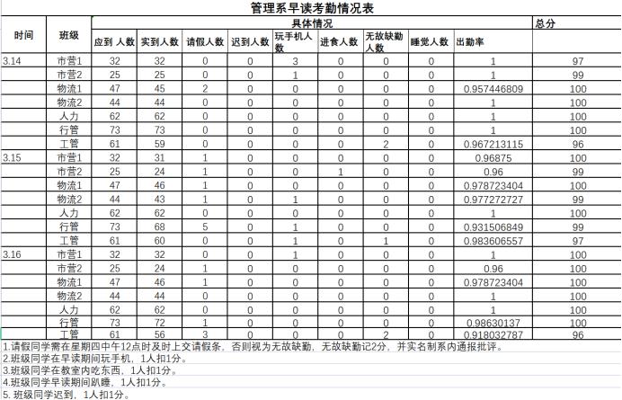 为进一步加强学生考勤工作的管理,规范教育教学秩序,树立良好的学风,根据 《关于规范学生早读考勤管理制度的通知》有关规定,现将各班早读情况进行公示。
