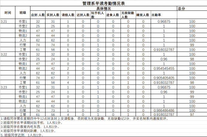 为进一步加强学生考勤工作的管理,规范教育教学秩序,树立良好的学风,根据 《关于规范学生早读考勤管理制度的通知》有关规定,现将各班早读情况进行公示。