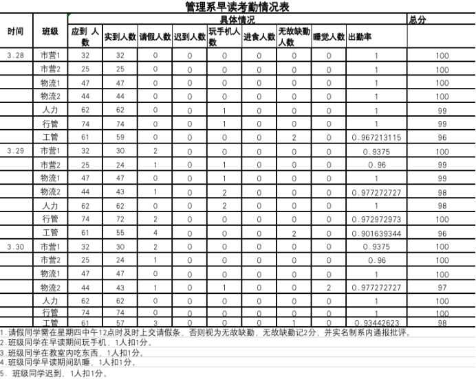 为进一步加强学生考勤工作的管理,规范教育教学秩序,树立良好的学风,根据 《关于规范学生早读考勤管理制度的通知》有关规定,现将各班早读情况进行公示。