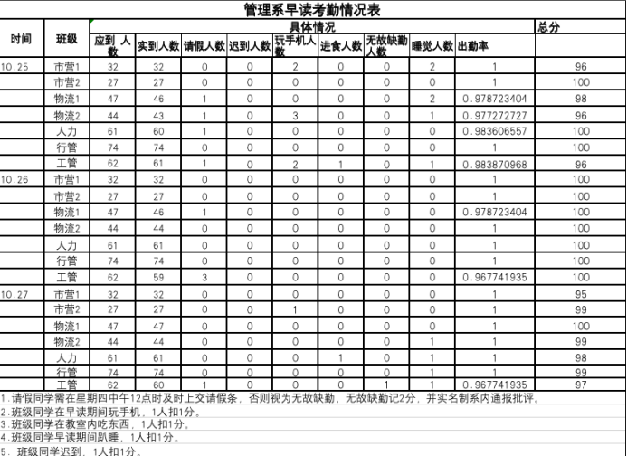 为进一步加强学生考勤工作的管理,规范教育教学秩序,树立良好的学风,根据 《关于规范学生早读考勤管理制度的通知》有关规定,现将各班早读情况进行公示。