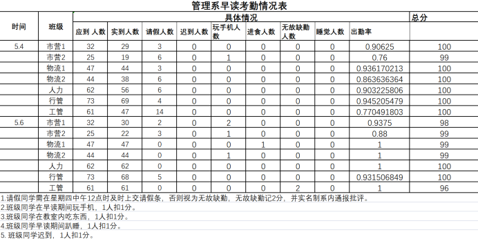 为进一步加强学生考勤工作的管理,规范教育教学秩序,树立良好的学风,根据 《关于规范学生早读考勤管理制度的通知》有关规定,现将各班早读情况进行公示。