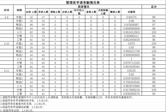 为进一步加强学生考勤工作的管理,规范教育教学秩序,树立良好的学风,根据 《关于规范学生早读考勤管理制度的通知》有关规定,现将各班早读情况进行公示。