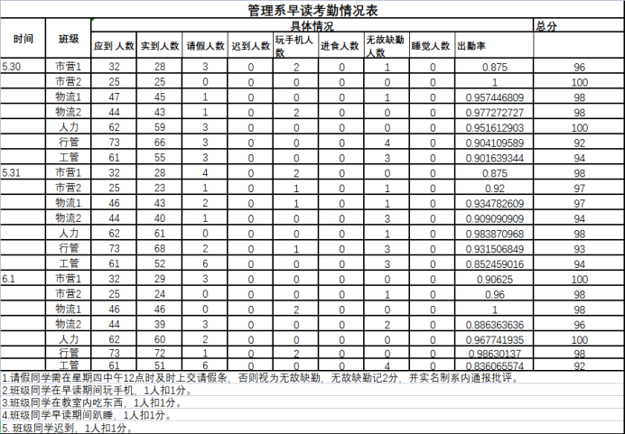 为进一步加强学生考勤工作的管理,规范教育教学秩序,树立良好的学风,根据 《关于规范学生早读考勤管理制度的通知》有关规定,现将各班早读情况进行公示。