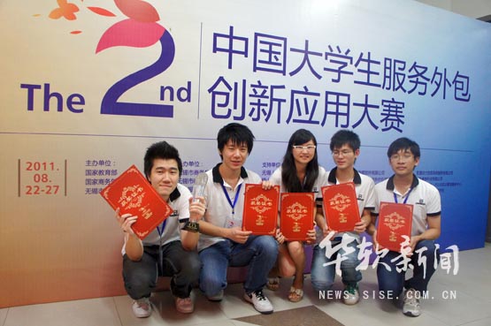 本网讯 8月27日,我院软件工程系卢俊、陶文亮、黄芳、李志坚、张奕锐五位同学代表学院首次参加教育部、商务部和无锡市政府联合举办的第二届中国大学生服务外包创新应用大赛,与来自清华大学等85家大学代表队450名选手以及台湾和香港大学生经过预赛和决赛后,我院与厦门大学、北京交通大学并列A组全国三等奖,取得了骄人的成绩。