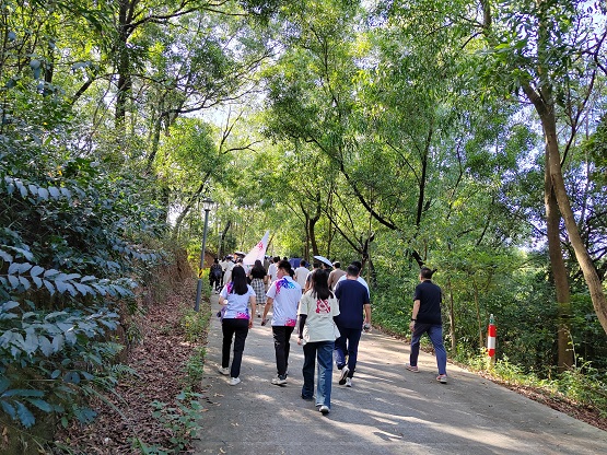 本网讯 10月24日下午,广州软件学院工会举办一年一度的教职工登“马仔山”活动。学校党委书记兼工会主席刘友坤、党委副书记兼工会副主席张广金、副董事长助理叶倩如、工会副主席王婧、各机关及系部教职工参加登山活动。