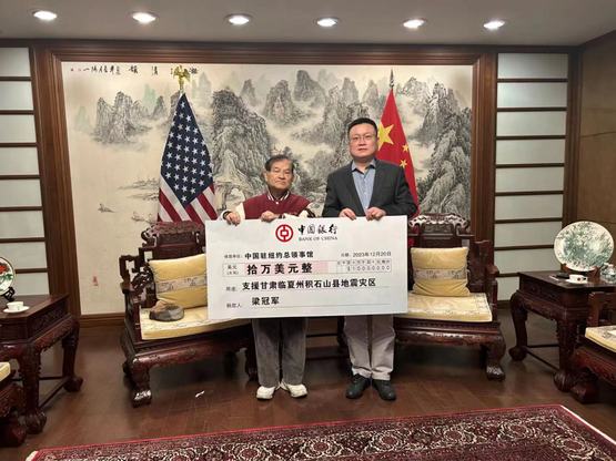 本网讯 12月18日23时59分,甘肃临夏州积石山县发生6.2级地震,灾情发生后,牵动着海内外每一名中华儿女的心。12月20日,中华海外联谊会副会长、中国和平统一促进会常务理事、全美华裔总商会主席、广州软件学院董事长梁冠军先生以个人名义捐款10万美元,并委托中国领事馆转交给甘肃临夏州积石山灾区,用于甘肃临夏州积石山县及周边受灾地区的紧急救援、受灾群众生活救助、救援队伍支持等相关工作。