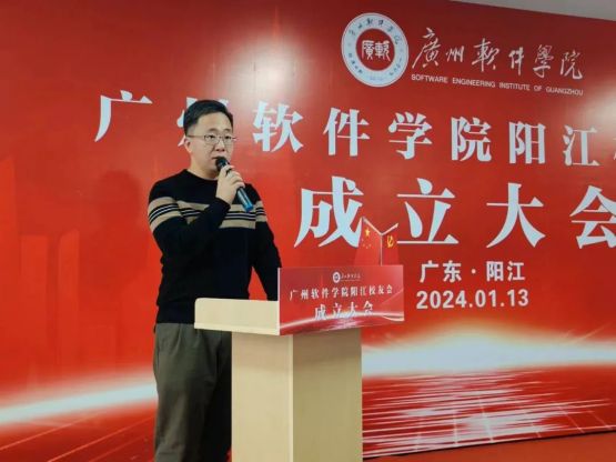 本网讯 2024年1月13日下午,广州软件学院阳江校友会成立大会在广东姚宜农业投资有限公司顺利召开。广州软件学院校长、校友会会长张强,党委副书记、校友会常务副会长张广金,校长办公室主任李涛,学生处处长、校友会副会长陈石宇,校长办公室副主任、校友会副会长邓堪生,学校教师代表,各地校友会负责人代表以及广州软件学院阳江校友代表欢聚一堂,带着对母校的热爱、对校友的情谊,共同见证广州软件学院阳江校友会的成立。