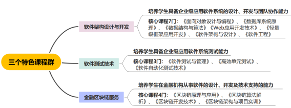 根据新的人才培养目标和培养方案,紧跟国家发展战略,适时研究和更新教学内容,编写适合本专业人才培养的系列教材,建立了“软件架构设计与开发、软件测试技术和金融区块链服务”三个特色课程群。