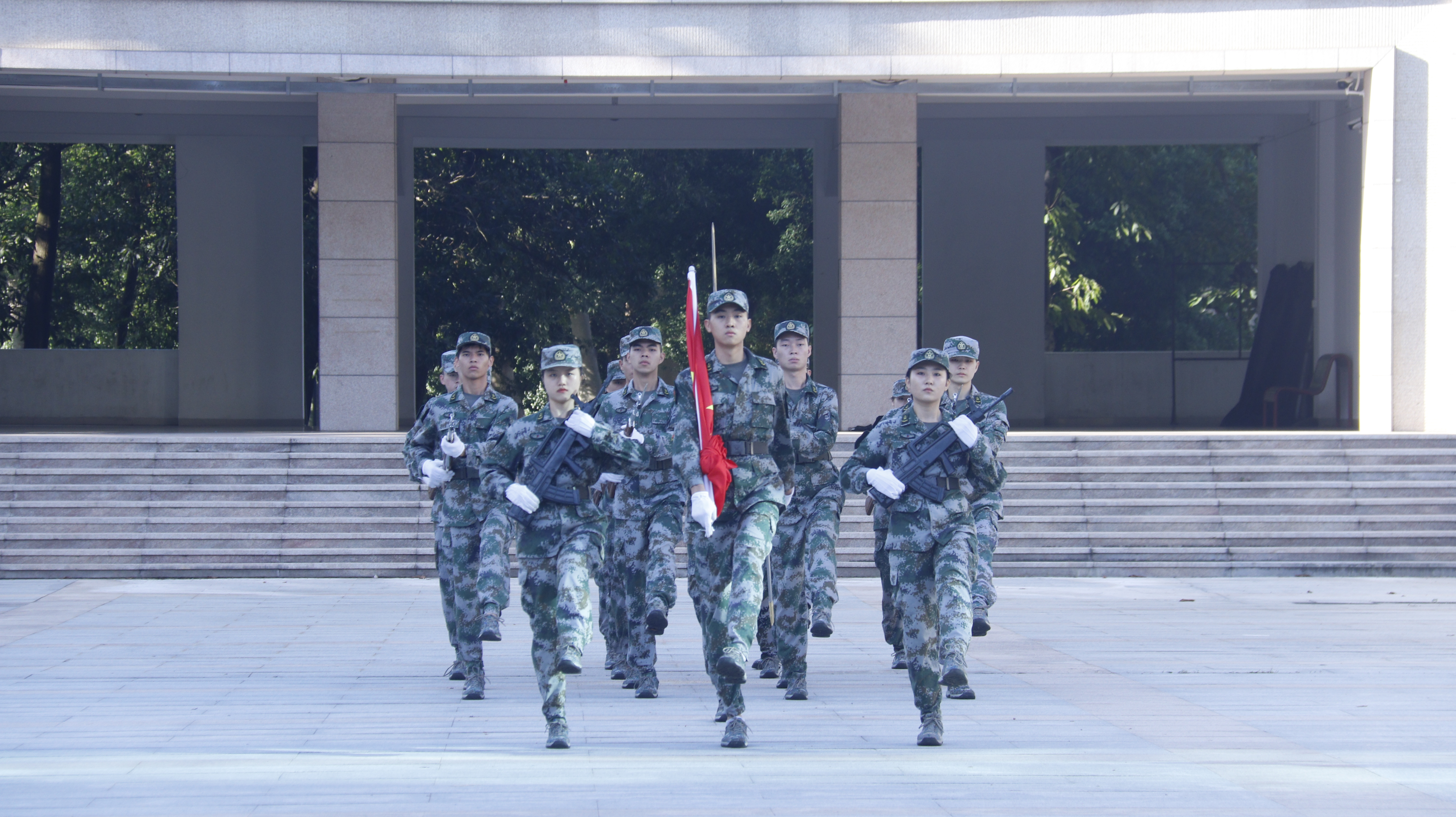 国旗护卫队成员迈着铿锵有力的步伐走向旗台。国歌奏响,擎旗手振臂一挥,鲜艳的五星红旗在全体学员的注视下冉冉升起,迎风飘扬。