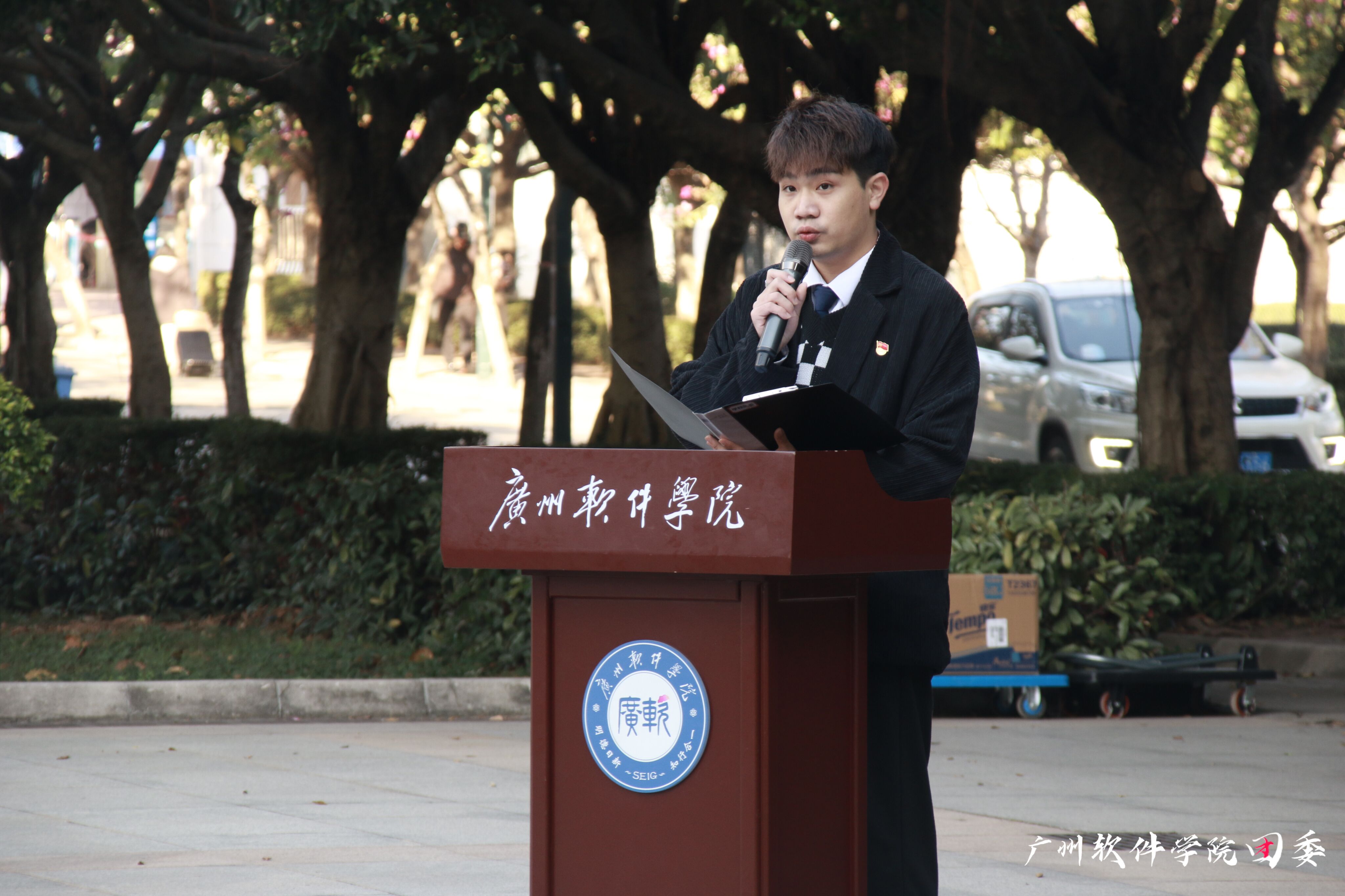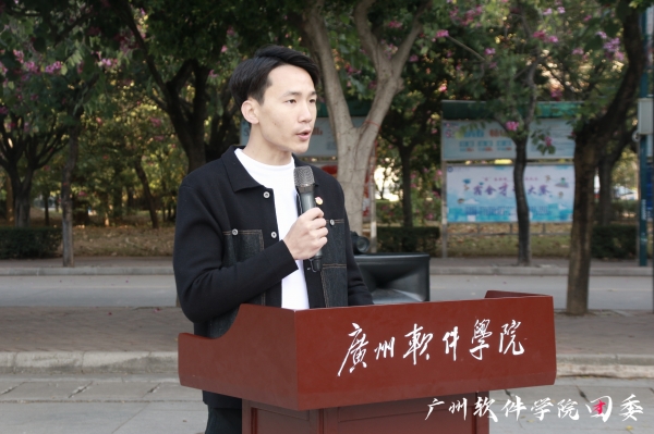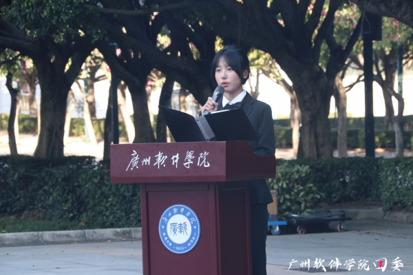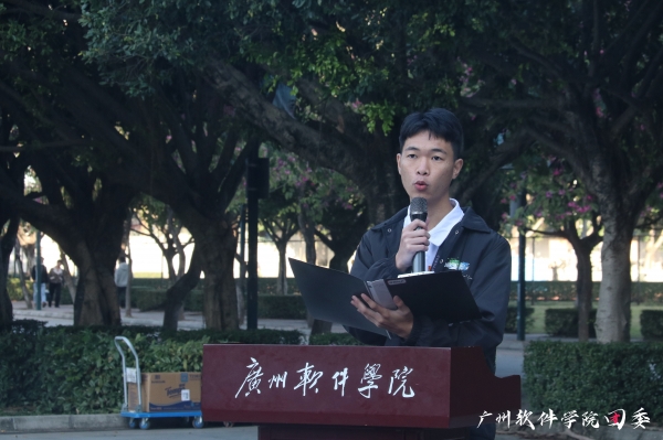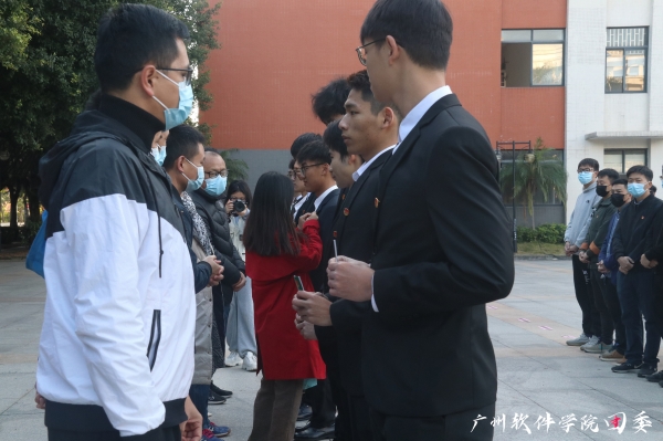 入团仪式在雄壮的国歌中拉开帷幕,校团委朱亮亮副书记宣读《广州软件学院关于2021年发展团员名单宣读报告》并向新团员介绍入团意义。各系党总支书记向新团员佩戴团徽、发放团员证。