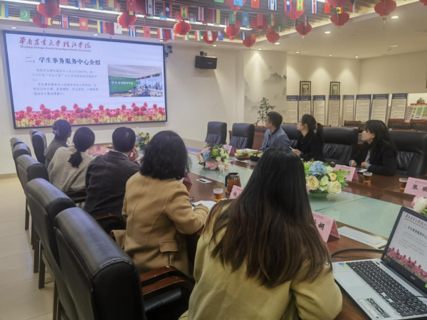 华南农业大学珠江学院学生处周玲军处长一行对我校学生处同仁的到访表示热烈欢迎,资助中心廖自娴老师对“一站式”服务大厅的建设历程、运作模式、管理制度、工作内容和服务理念等方面进行了全面介绍。我校同仁提出了当前建设师生服务大厅建设遇到的困境,在管理制度、学生队伍培养、宣传、业务开展情况等方面进行深入探讨。座谈会后,参观珠江学院“一站式”学生服务大厅,实地深入了解“一站式”学生服务大厅的业务办理流程、硬件设施建设等。