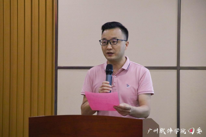 党委张广金副书记宣读《关于表彰广州软件学院第十七届“挑战杯”广东大学生课外学术科技作品竞赛获奖集体和个人的决定》,肯定了我校学生在科技学术竞赛中展现了青春向党、不负人民,锐意创新、迎接挑战的精神风貌。