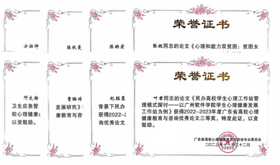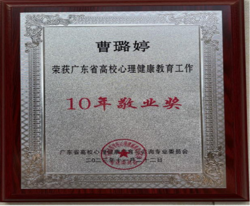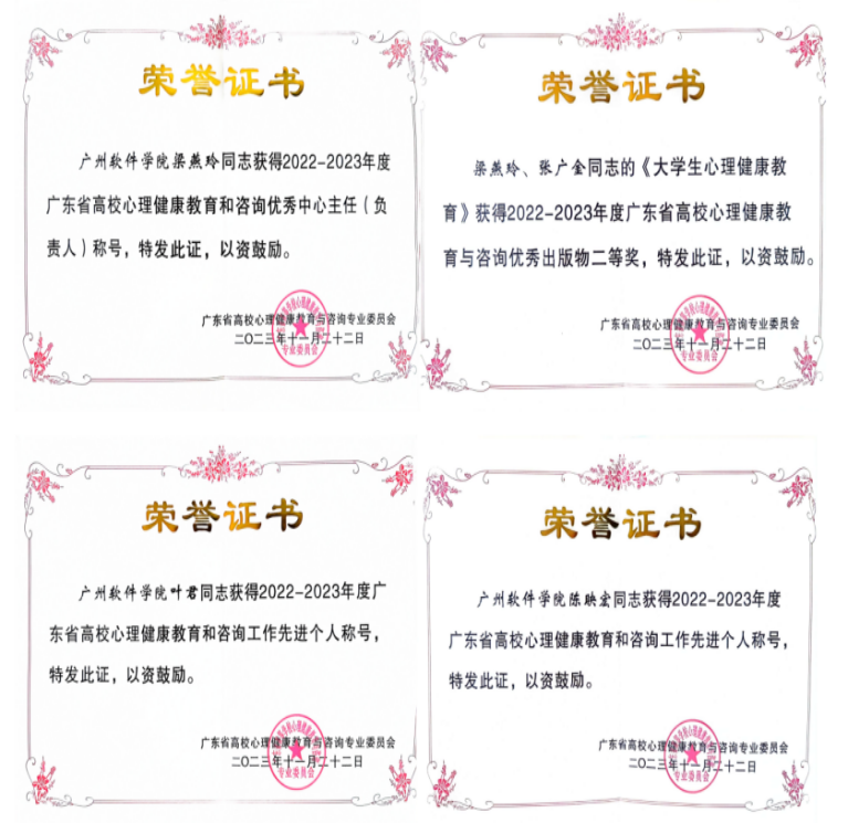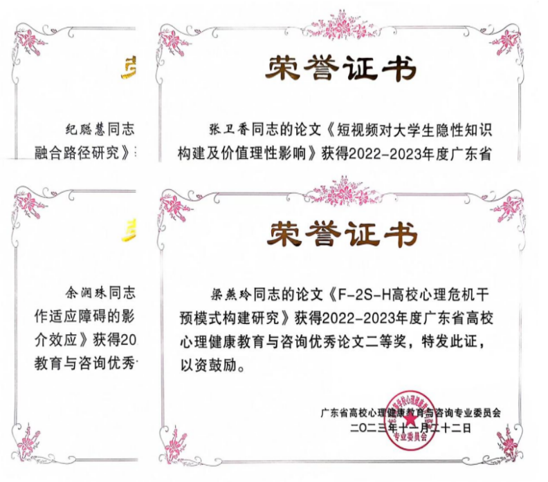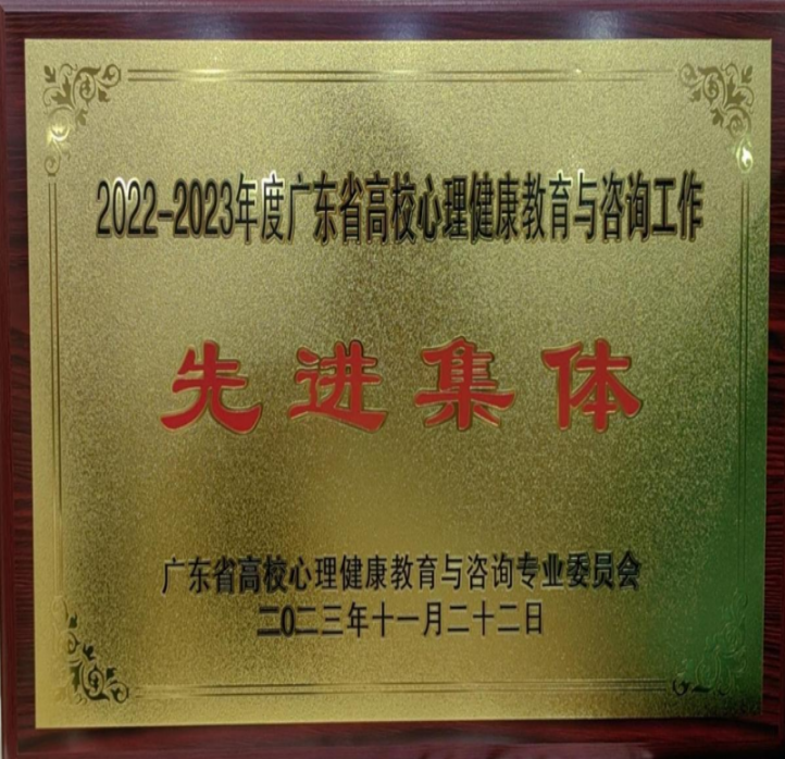 2022-2023年度中我校心理工作成绩再续辉煌,获评“广东省高校心理健康教育与咨询工作先进集体”,这是我校第五次、也是近六年来连续三届获此殊荣。同时,学生处心理健康教育与素质拓展中心(以下简称心理中心)主任梁燕玲再次获评“广东省高校心理健康教育与咨询工作优秀中心主任”;心理中心曹璐婷老师荣获“广东省高校心理健康教育工作10年敬业奖”;心理中心叶君老师、数字经济与管理学院陈映宏老师荣获“2022-2023年度广东省高校心理健康教育与咨询工作先进个人”。另外,我校在心理健康教育的教研科研工作方面也是成果突出,梁燕玲、张广金主编的《大学生心理健康教育》教材获评2022-2023年度广东省高校心理健康教育与咨询工作优秀出版物二等奖;我校多位老师的科研成果在2022-2023年度广东省高校心理健康教育与咨询优秀论文评选中获二等奖4个、三等奖8个、共计12个奖项。此外,我校梁燕玲老师还受邀在省心理工作年会上做“心理中心主任工作经验”分享;梁燕玲老师和曹璐婷老师的论文成果在大会上分享交流。