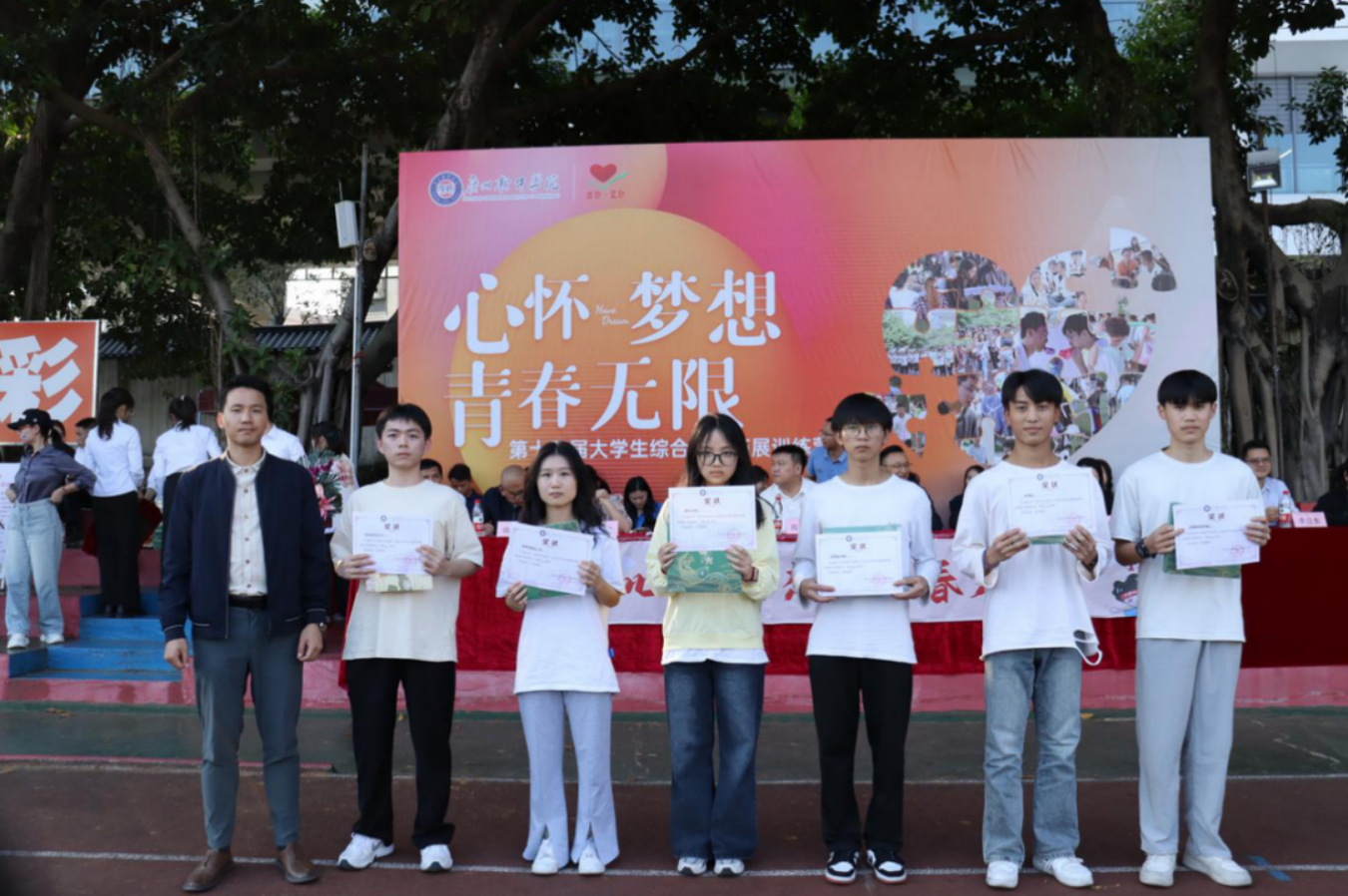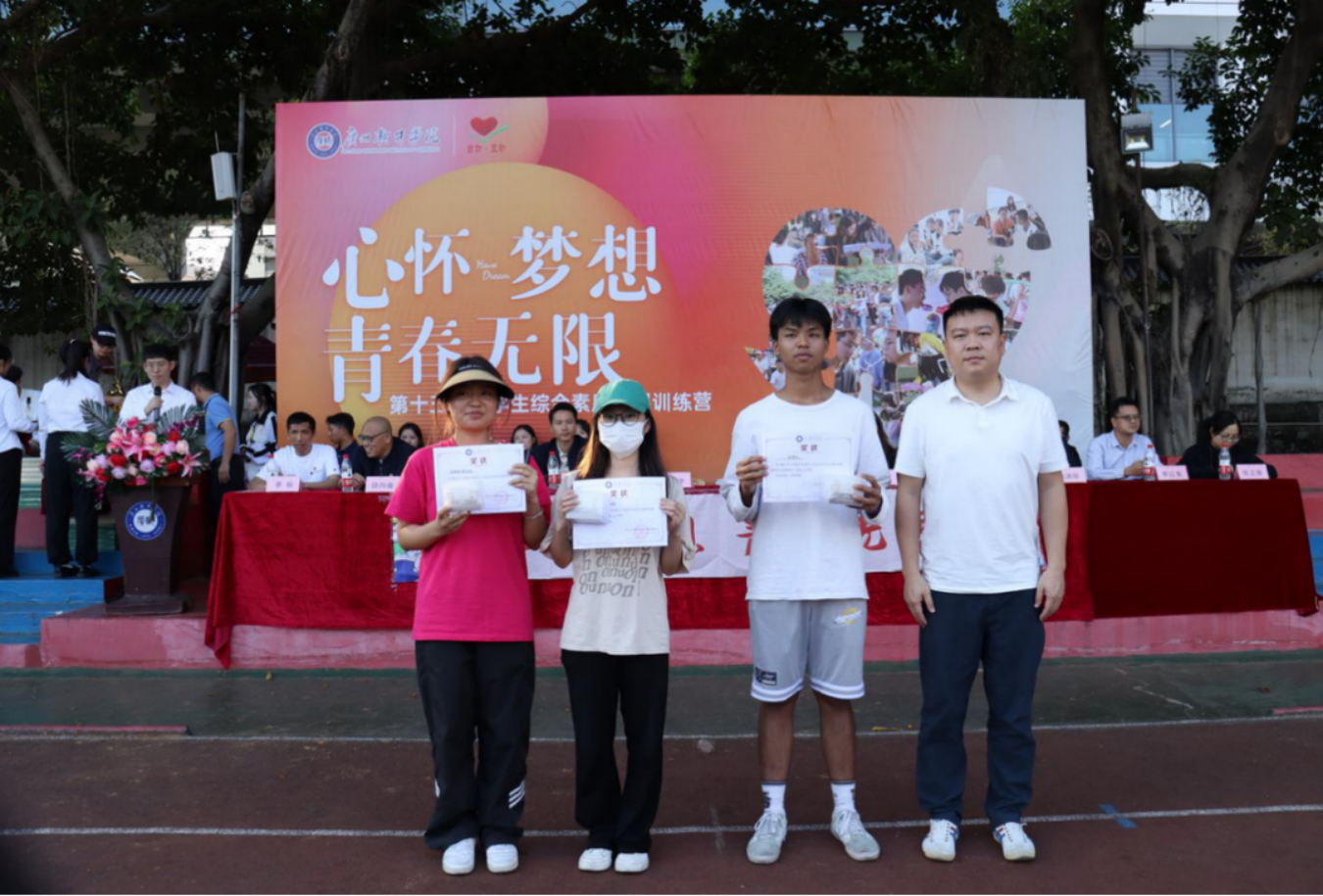 11月的广软,繁花似锦,尽是粉色浪漫。11月28日下午,我校举办“心怀梦想,青春无限”第十五届大学生综合素质拓展训练营暨综合素质拓展训练月闭幕活动。学校党委副书记、纪委书记张广金,学生处处长陈石宇,校团委书记朱亮亮,各院系党组织书记,学生处副处长冯焯彬,心理中心全体教师,二级心理辅导站指导老师以及现场1000余名同学参加本次活动。