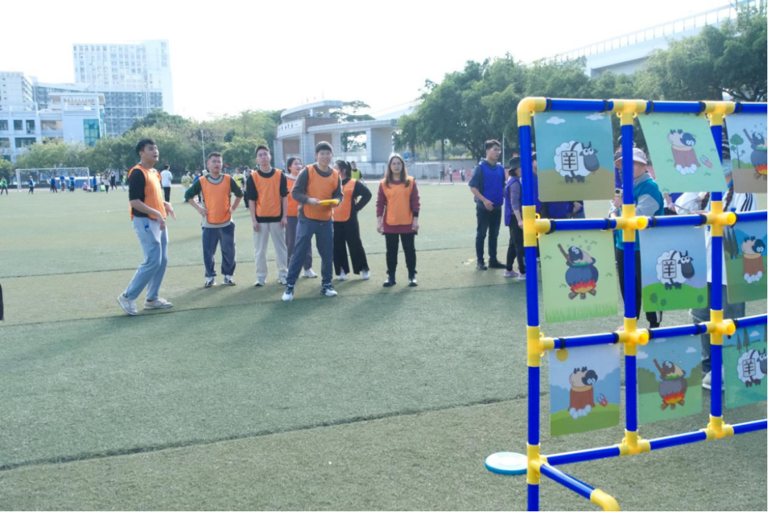 本次运动会设置了多项团体趣味比赛项目,各项游戏采取积分制,“飞盘九宫格”“反方向口令”“爱的魔力转圈圈”“同心击鼓”比赛采取排名加分法,“毛毛虫竞速”“欢乐踩一踩”“无敌风火轮”采取pk制度,最后累计计算所有队伍分数进行排名。